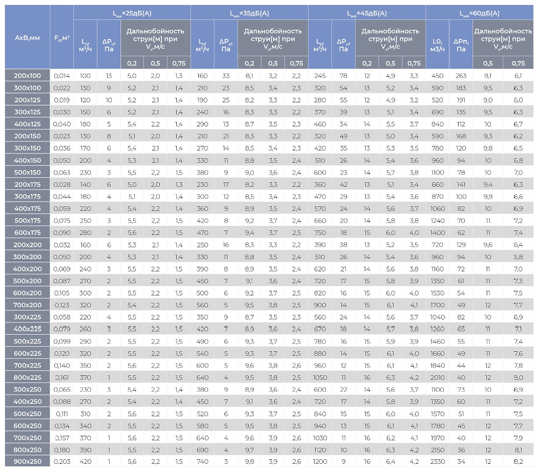 Данные для подбора для подбора решеток ДВРЦ, ДВРЦ-РП при углах наклона жалюзи α1 = 0°, α2 = 0°