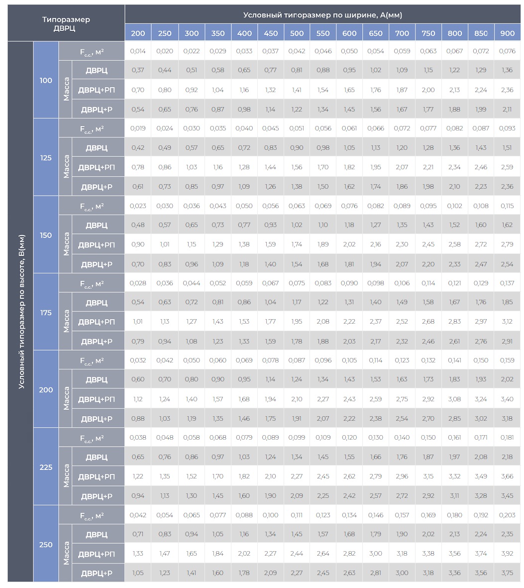 Стандартные типоразмеры, площадь свободного сечения (Fc.с.) и теоретическая масса (m) ДВРЦ