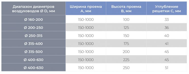 Допустимые диаметры воздуховодов для цилиндрических решеток