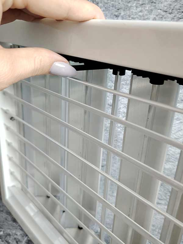 При подаче свежего воздуха в помещение с помощью регулируемых лопаток возможно изменять направление приточной струи в вертикальной плоскости. Лопатки (жалюзи) установлены на рамку с помощью пластиковых втулок, обеспечивающих плавное регулирование угла наклона и фиксацию в заданном положении. Крепление решеток выполняется с помощью самонарезающих винтов или пружинных фиксаторов для скрытого крепления.