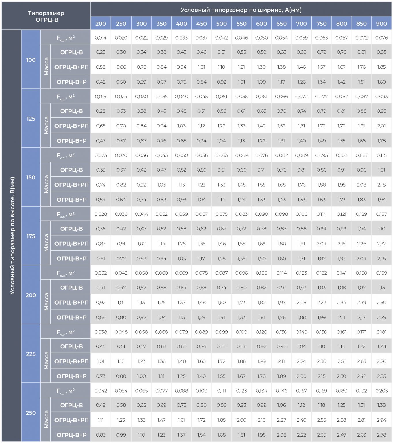 Стандартные типоразмеры, площадь свободного сечения (Fc.с.) и теоретическая масса (m) ОГРЦ-В