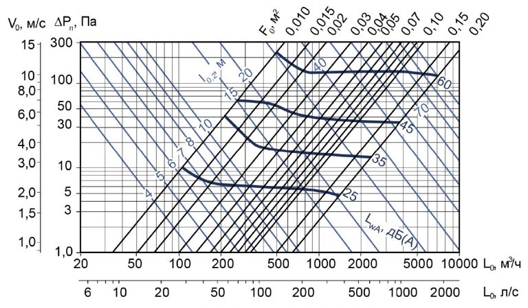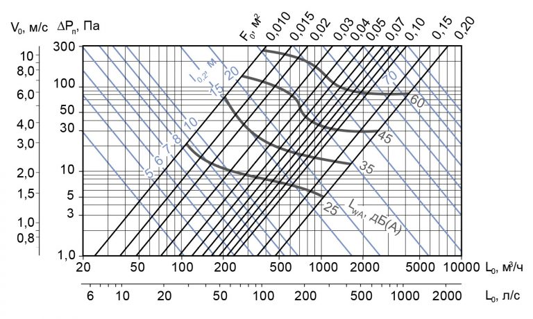 Диаграмма для подбора типоразмера и определения аэродинамических характеристик