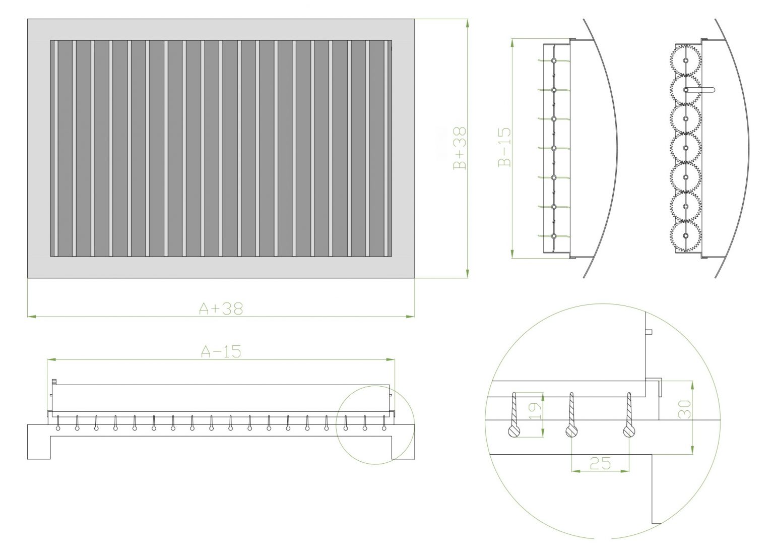 Возможна поставка решеток в комплекте с выкрашенными в цвет решетки саморезами. По умолчанию решетки поставляются без саморезов, без крепежных отверстий в рамке.