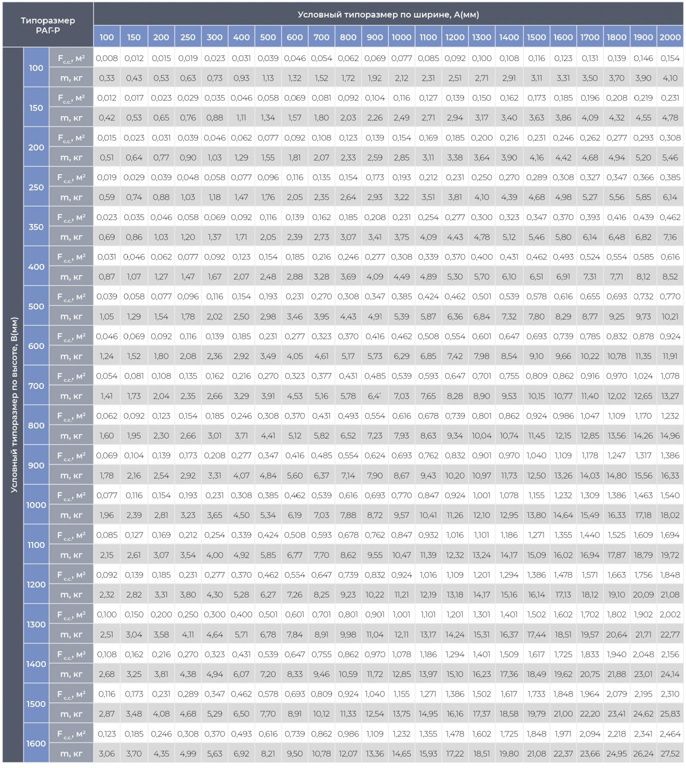 Стандартные типоразмеры, площадь свободного сечения (Fc.с.) и теоретическая масса (m) ОГР-Р