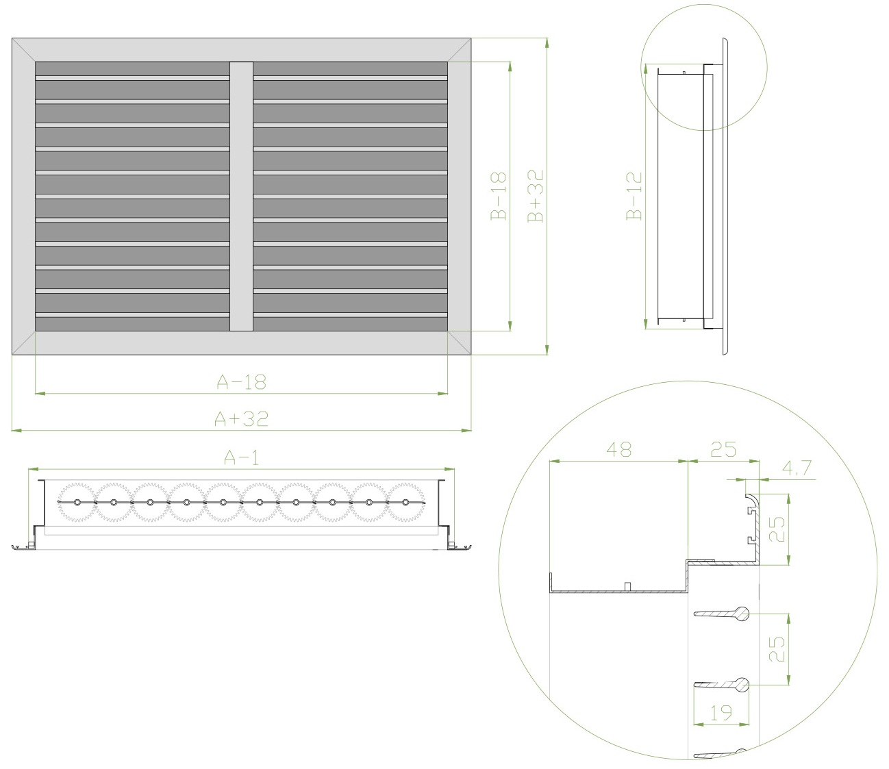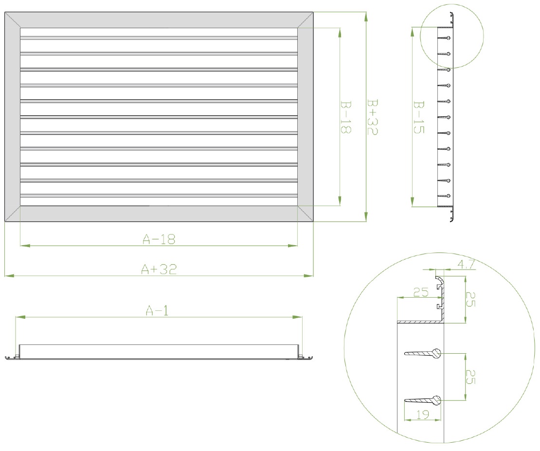 Габаритно-посадочные размеры регулируемой решетки ОГР-РП . АхВ размеры строительного проема.