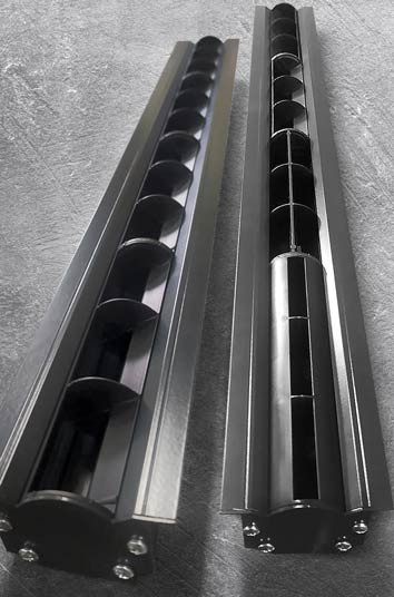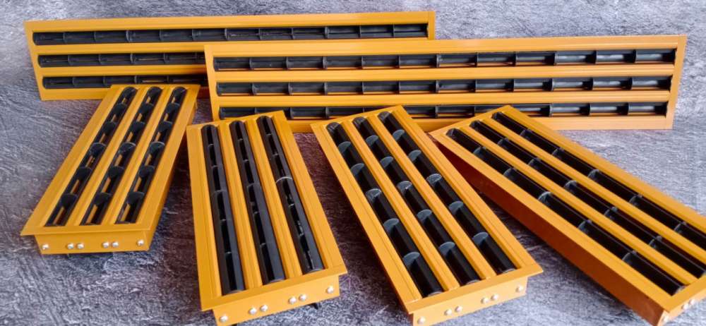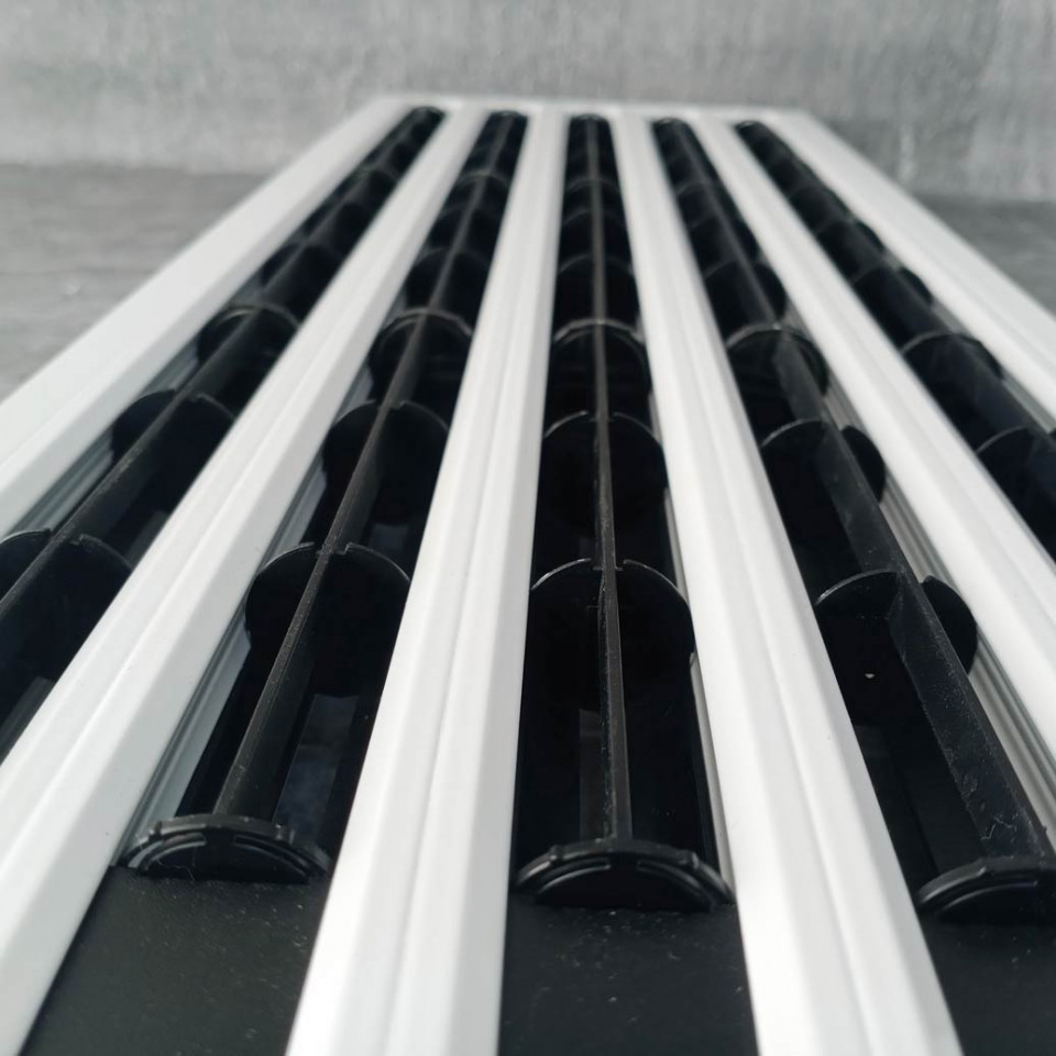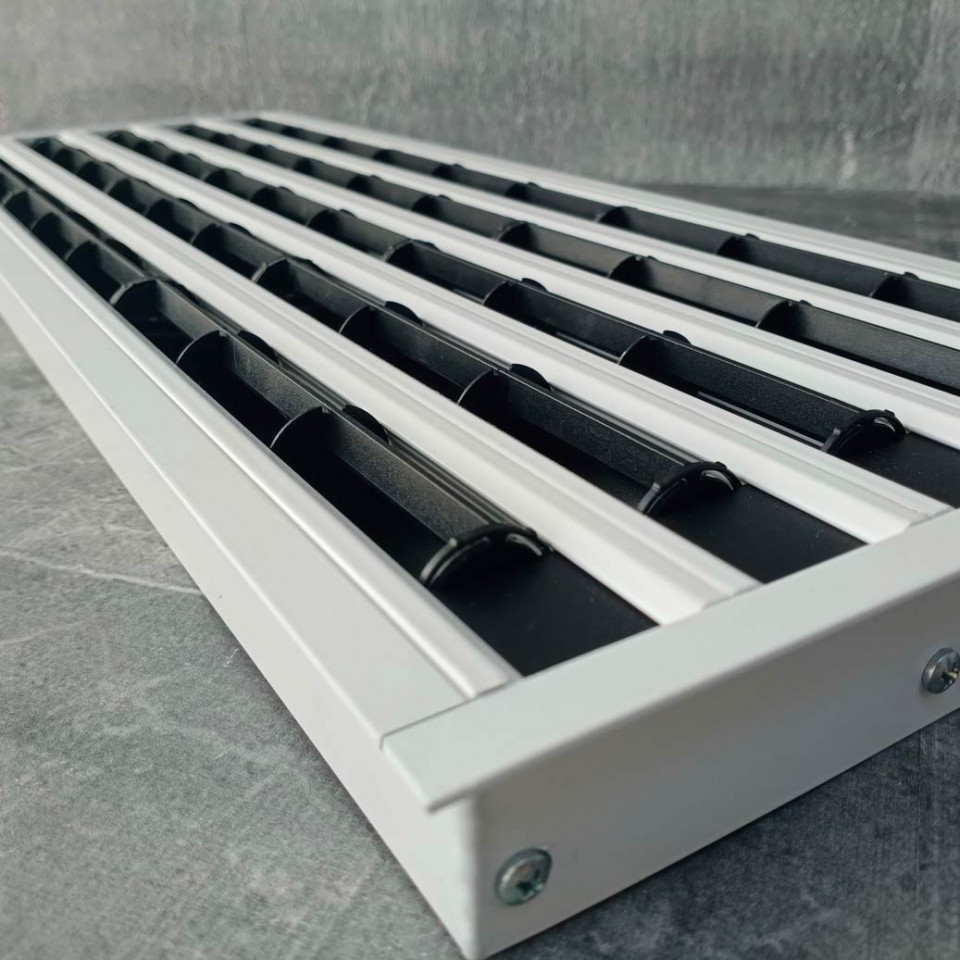 - Используемые материалы. Корпус диффузоров ARPL35M изготавливаются из экструдированного алюминиевого профиля АД31 по ГОСТ 22233-2001, а устройства регулирования направления приточных струй – из АВС пластика. По умолчанию корпус диффузоров окрашивается в стандартный белый цвет RAL 9016, по индивидуальному заказу возможна окраска в любой цвет по шкале RAL. Возможные цвета направляющих из пластика: белый (близкий к RAL 9016), серый (близкий к RAL 9006) и черный (близкий к RAL 9005)