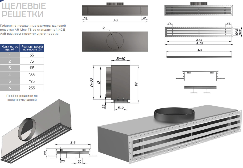 Щелевые решетки скрытого монтажа AR-Line-TS используются в системах вентиляции и кондиционирования в качестве конечного декоративного элемента инженерной системы. Они обеспечивают подачу свежего или удаление загрязненного воздуха из помещений. Отличительной особенностью решетки AR-Line-TS является съемное жалюзийное полотно на магнитах, что значительно облегчает обслуживание вентиляционного канала в процессе эксплуатации. Т-образные жалюзи шириной 20 мм образуют ровные щели. После монтажа линейной решетки видимой частью в помещении остается только жалюзийное полотно. Для удобства монтажа рамка оснащена «полкой» 6 мм под соответствующую толщину гипсокартона или комбинации листов разной толщины. Отверстия в рамке улучшают адгезию финишного материала. Щелевые решетки AR-Line-TS изготавливаются из экструдированного алюминиевого профиля АД31 по ГОСТ 22233-2001. По умолчанию корпус решетки окрашивается в стандартный белый цвет RAL 9016, а внутренняя перфорированная кассета в чёрный цвет RAL9005. По индивидуальному заказу возможна окраска в любой цвет по шкале RAL как корпуса, так и внутренней части. Решетки данного типа возможно изготавливать любого размера с шагом 1 мм. Минимальные рекомендуемые размеры 200х100, максимальные – 2000х1000. К воздуховоду щелевые решетки монтируются посредством камеры статического давления (КСД). Решетка крепится саморезами к закладным деталям в КСД через крепежные элементы в решетке. После установки решетки к КСД, производится облицовка гипсокартоном (под гипсокартон на решетке предусмотрена полка 6 мм). Для лучшей адгезии финишного материала рамка имеет перфорацию.