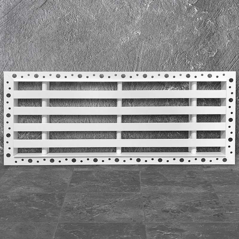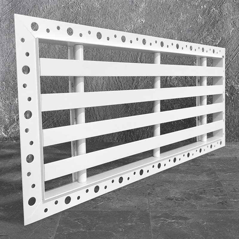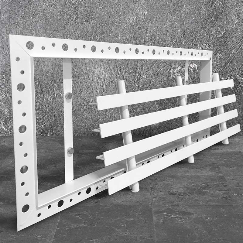 Щелевые решетки скрытого монтажа AR-Line-TS используются в системах вентиляции и кондиционирования в качестве конечного декоративного элемента инженерной системы. Они обеспечивают подачу свежего или удаление загрязненного воздуха из помещений. Отличительной особенностью решетки AR-Line-TS является съемное жалюзийное полотно на магнитах, что значительно облегчает обслуживание вентиляционного канала в процессе эксплуатации. Т-образные жалюзи шириной 20 мм образуют ровные щели. После монтажа линейной решетки видимой частью в помещении остается только жалюзийное полотно. Для удобства монтажа рамка оснащена «полкой» 6 мм под соответствующую толщину гипсокартона или комбинации листов разной толщины. Отверстия в рамке улучшают адгезию финишного материала. Щелевые решетки AR-Line-TS изготавливаются из экструдированного алюминиевого профиля АД31 по ГОСТ 22233-2001. По умолчанию корпус решетки окрашивается в стандартный белый цвет RAL 9016, а внутренняя перфорированная кассета в чёрный цвет RAL9005. По индивидуальному заказу возможна окраска в любой цвет по шкале RAL как корпуса, так и внутренней части. Решетки данного типа возможно изготавливать любого размера с шагом 1 мм. Минимальные рекомендуемые размеры 200х100, максимальные – 2000х1000. К воздуховоду щелевые решетки монтируются посредством камеры статического давления (КСД). Решетка крепится саморезами к закладным деталям в КСД через крепежные элементы в решетке. После установки решетки к КСД, производится облицовка гипсокартоном (под гипсокартон на решетке предусмотрена полка 6 мм). Для лучшей адгезии финишного материала рамка имеет перфорацию.