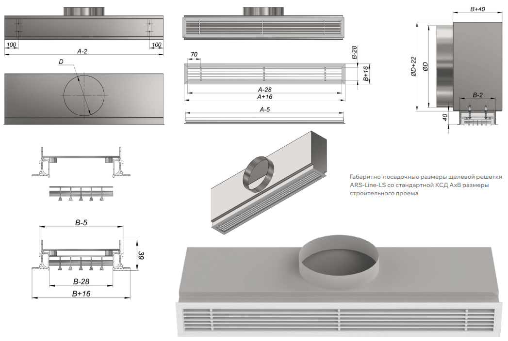 Щелевые решетки со съемным жалюзийным полотном ARS-Line-LS используются в системах вентиляции и кондиционирования в качестве конечного декоративного элемента инженерной системы. Они обеспечивают подачу свежего или удаление загрязненного воздуха из помещений. Отличительной особенностью решетки ARS-Line-LS является съемное жалюзийное полотно на магнитах, что значительно облегчает обслуживание вентиляционного канала в процессе эксплуатации. Неподвижные жалюзи Y-образной формы имеют ширину 5,5 мм и образуют ровные щели шириной 10 мм. Рамка линейной решетки имеет специальную форму для того, чтобы после монтажа решетки её не было видно, видимой частью в помещении остается только жалюзийное полотно. Рамка оснащена “полкой” 2,3 мм под шпаклевку. Ребристая поверхность профиля улучшает адгезию финишного материала. Решетки данного типа возможно изготавливать любого размера с шагом 1 мм. Минимальные рекомендуемые размеры 200х100, максимальные – 2000х1000. Щелевые решетки ARS-Line-LS изготавливаются из экструдированного алюминиевого профиля АД31 по ГОСТ 22233-2001. По умолчанию корпус решетки окрашивается в стандартный белый цвет RAL 9016. По индивидуальному заказу возможна окраска в любой цвет по шкале RAL. Для подключения к системе воздуховодов решетки комплектуются камерой статического давления – КСД или КСР. Камера статического давления является элементом систем вентиляции и кондиционирования воздуха, они обеспечивают равномерное распределение воздушных масс через сечение решетки. КСД состоит из стального корпуса с круглым патрубком для подсоединения к воздуховоду. КСР дополнительно оснащены устройством, регулирующим объем подаваемого воздуха, которое устанавливается во входном патрубке. Статическая камера изготавливается из оцинкованной листовой стали 0,4 – 1,5 мм в зависимости от размера и пожелания заказчика. По умолчанию все изделия поставляются в неокрашенном виде. К воздуховоду щелевые решетки монтируются посредством камеры статического давления(КСД). Решетка крепится саморезами к закладным деталям в КСД через крепежные элементы в решетке. После установки решетки к КСД, производится облицовка гипсокартоном (под гипсокартон на решетке предусмотрена полка 6 мм). Для лучшей адгезии финишного материала рамка имеет перфорацию.
