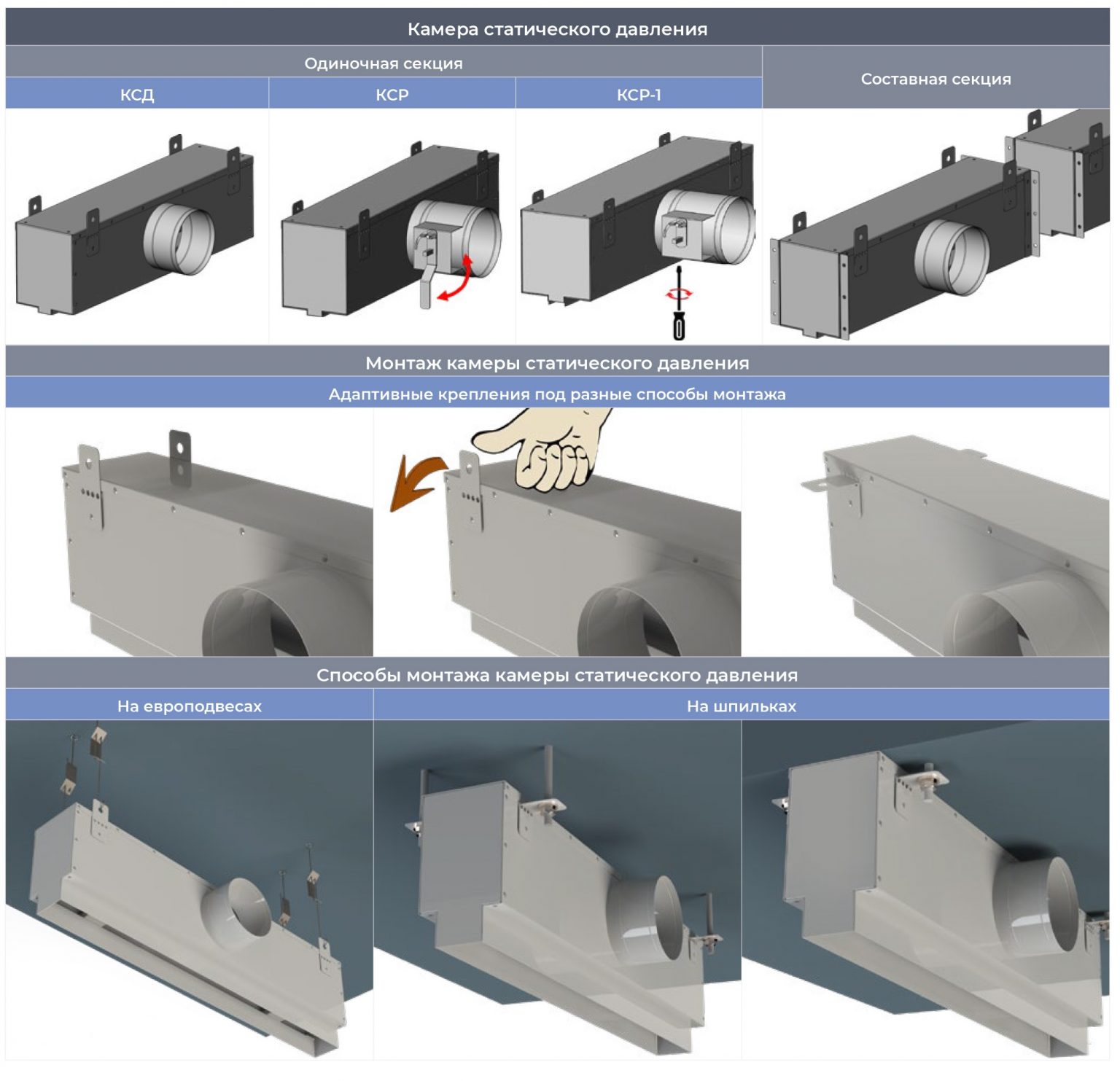 Камера статического давления является элементом систем вентиляции и кондиционирования воздуха, они обеспечивают равномерное распределение воздушных масс через сечение решетки. КСД состоит из стального корпуса с круглым патрубком для подсоединения к воздуховоду. КСР дополнительно оснащены устройством, регулирующим объем подаваемого воздуха, которое устанавливается во входном патрубке.