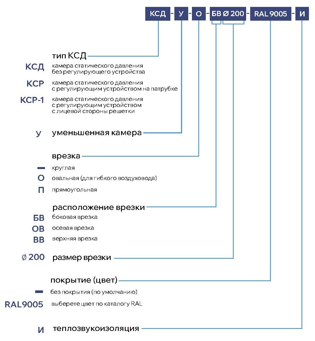 Для подключения к системе воздуховодов диффузоры комплектуются камерой статического давления – КСД или КСР.