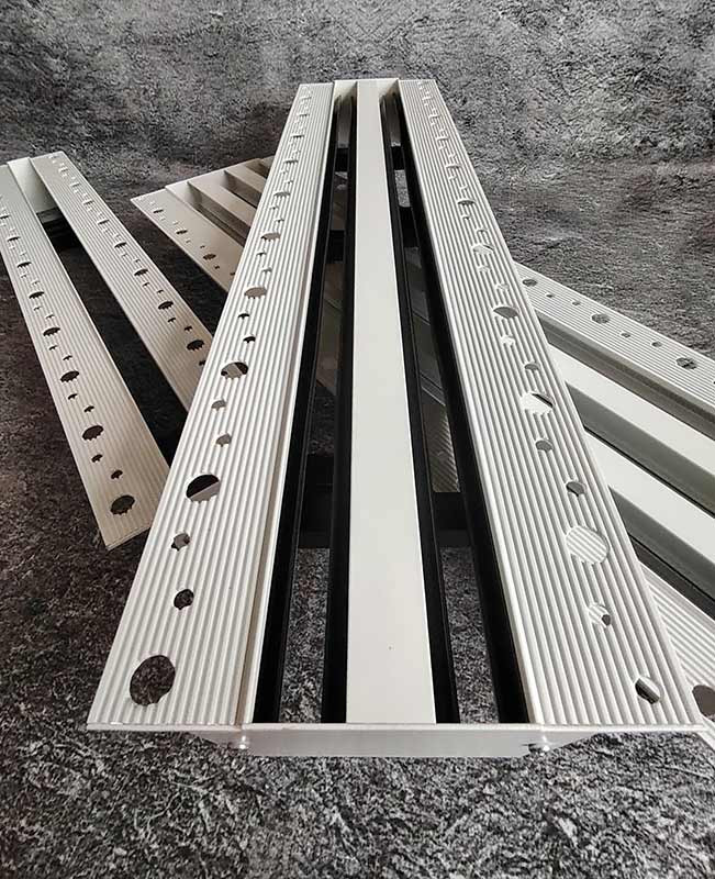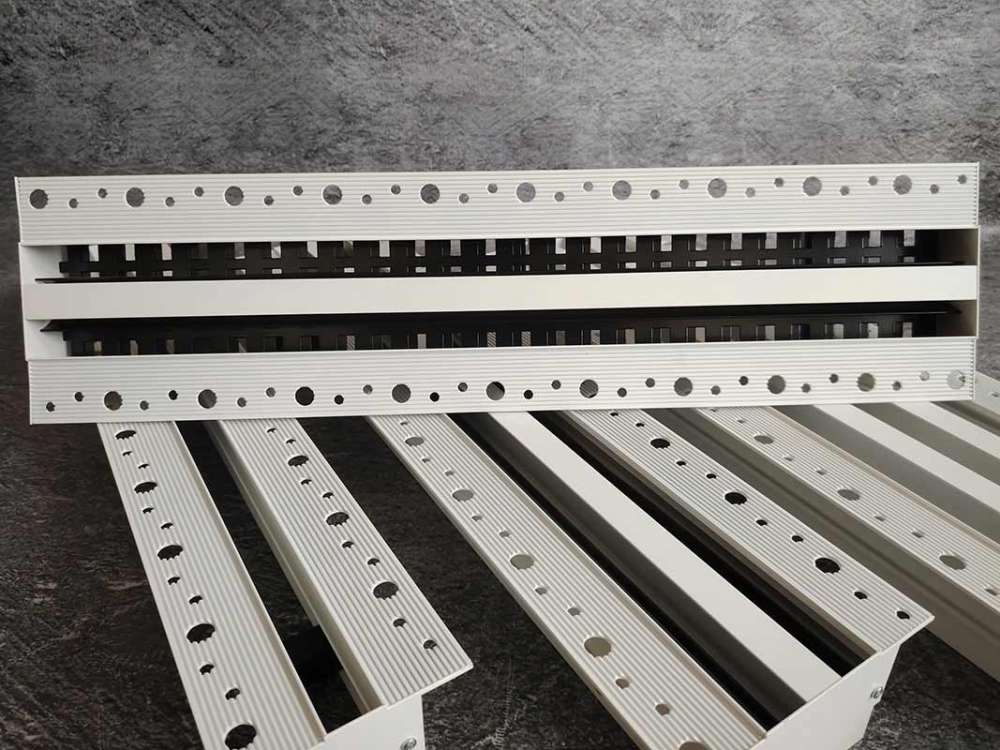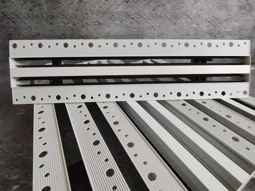 Конструкция профиля решетки предусматривает фланец с углублениями и отверстиями для лучшей адгезии финишного материала по длине решетки и заглушки с торца. После монтажа решетки, видимой частью в помещении остаются только щели.