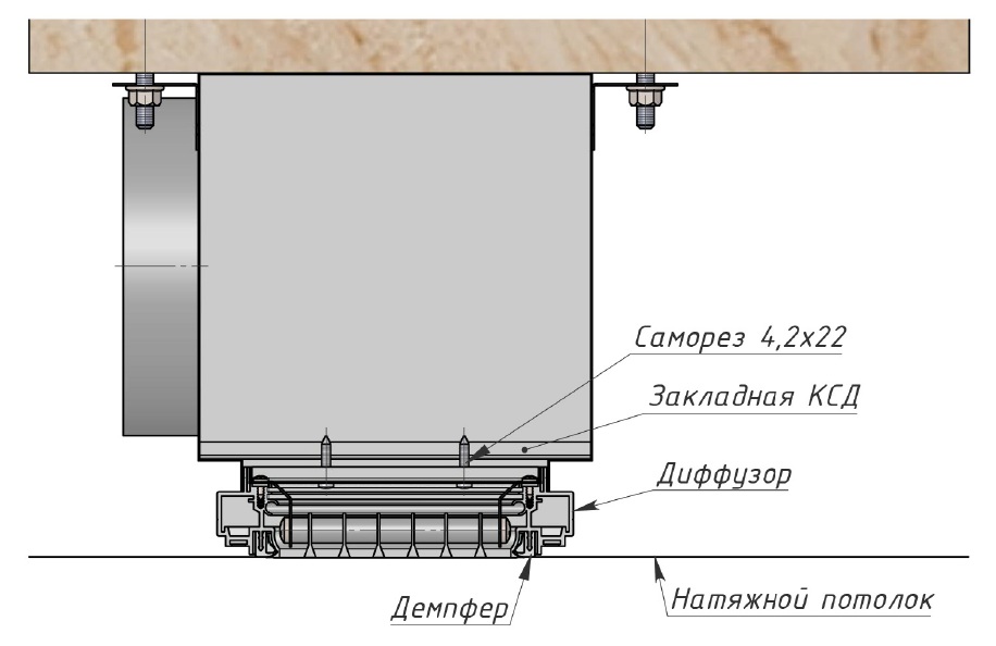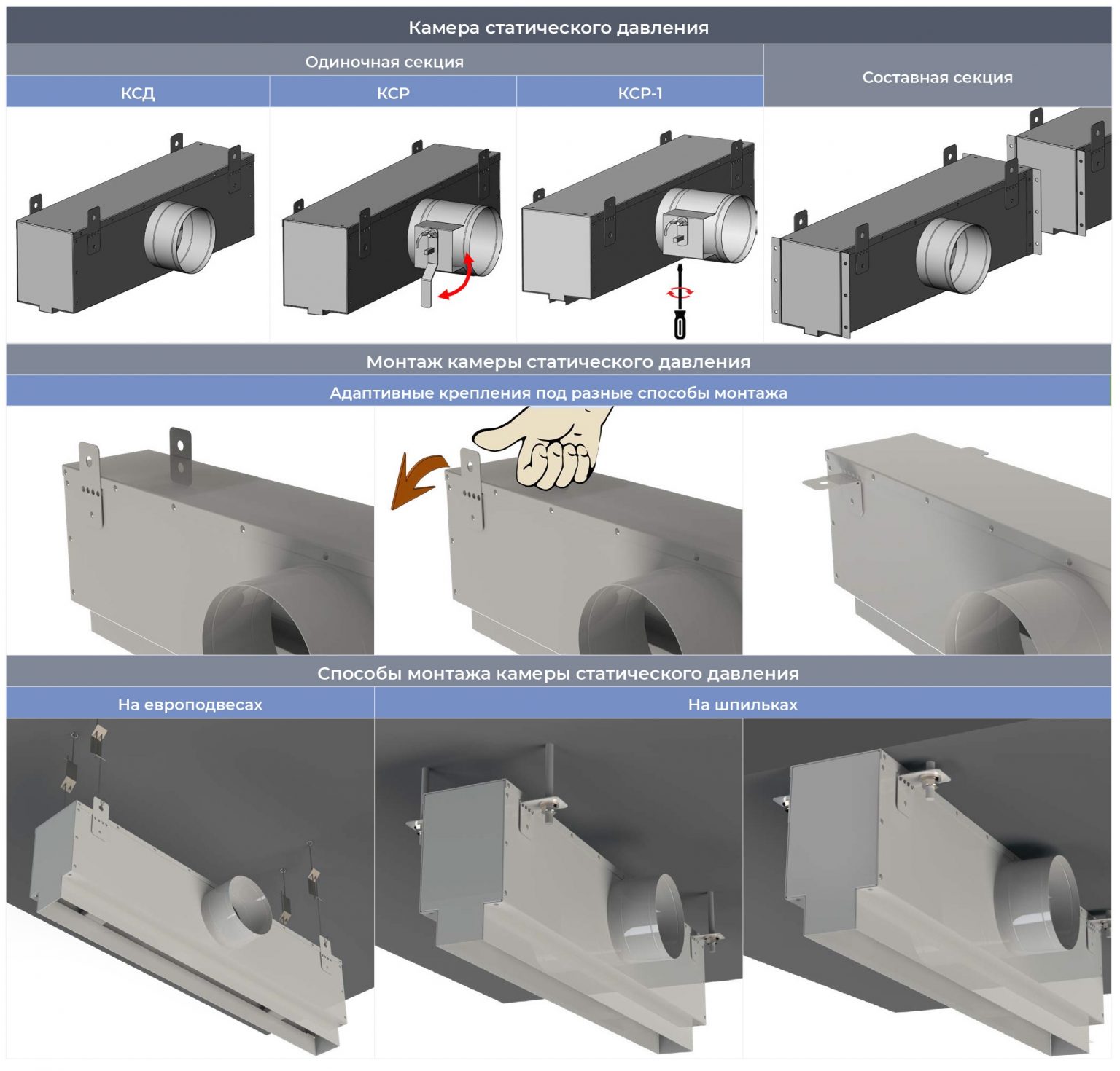 Для подключения диффузоров к системе вентиляции и кондиционирования используется камера статического давления (КСД или КСР). Она обеспечивает равномерное распределение воздушных масс через сечение решетки.