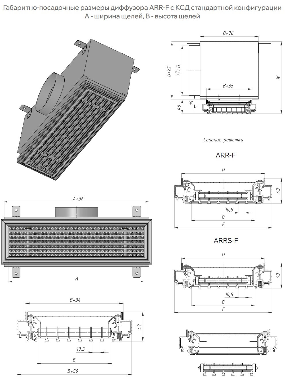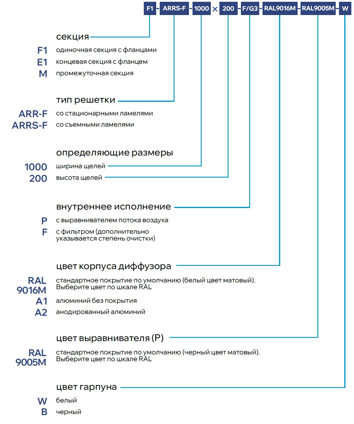 Щелевые решетки ARR-F и ARRS-F изготавливаются из экструдированного алюминиевого профиля АД31 по ГОСТ 22233-2018. По умолчанию корпус решетки окрашивается в стандартный белый цвет RAL 9016М матовый, а внутреннее исполнение в чёрный цвет RAL9005М матовый. По индивидуальному заказу возможна окраска в любой цвет по шкале RAL. Статическая камера изготавливается из оцинкованной листовой стали 0,4 – 1,5 мм в зависимости от размера и пожелания заказчика. По умолчанию все изделия поставляются в неокрашенном виде.