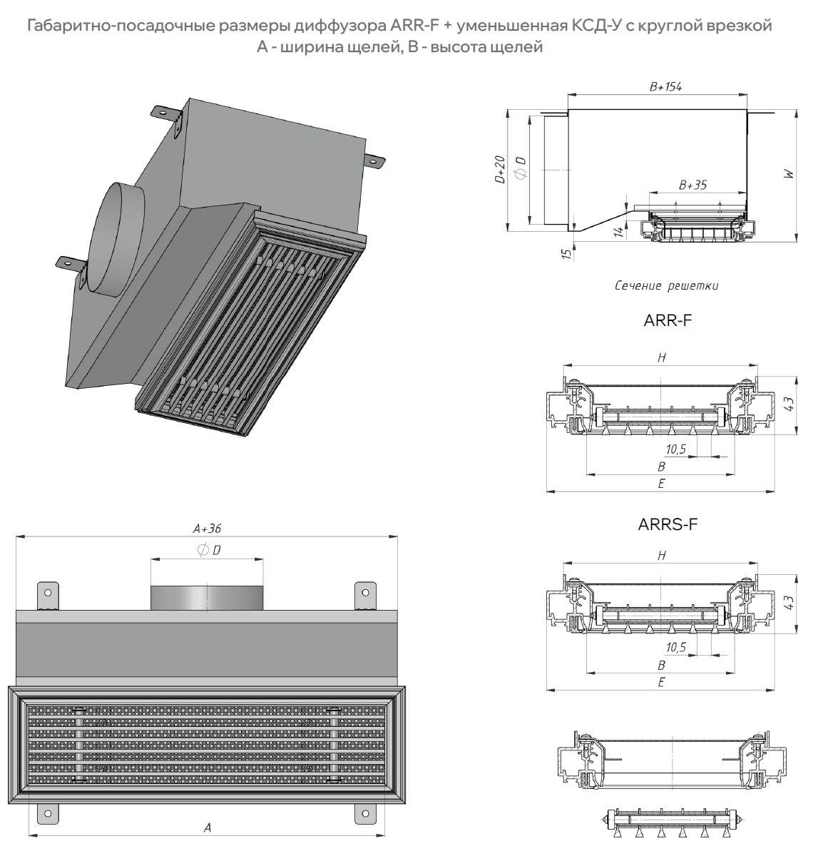 Уменьшенная камера статического давления позволяет максимально сохранить полезную площадь помещения за счет уменьшения монтажного пространства. Размер монтажного пространства (W) напрямую зависит от размера подключаемого воздуховода – чем меньше воздуховод, тем меньше адаптер для диффузора. В каталоге приведены рекомендуемые размеры воздуховода, но по запросу заказчика возможно изготовить адаптер с любой врезкой.