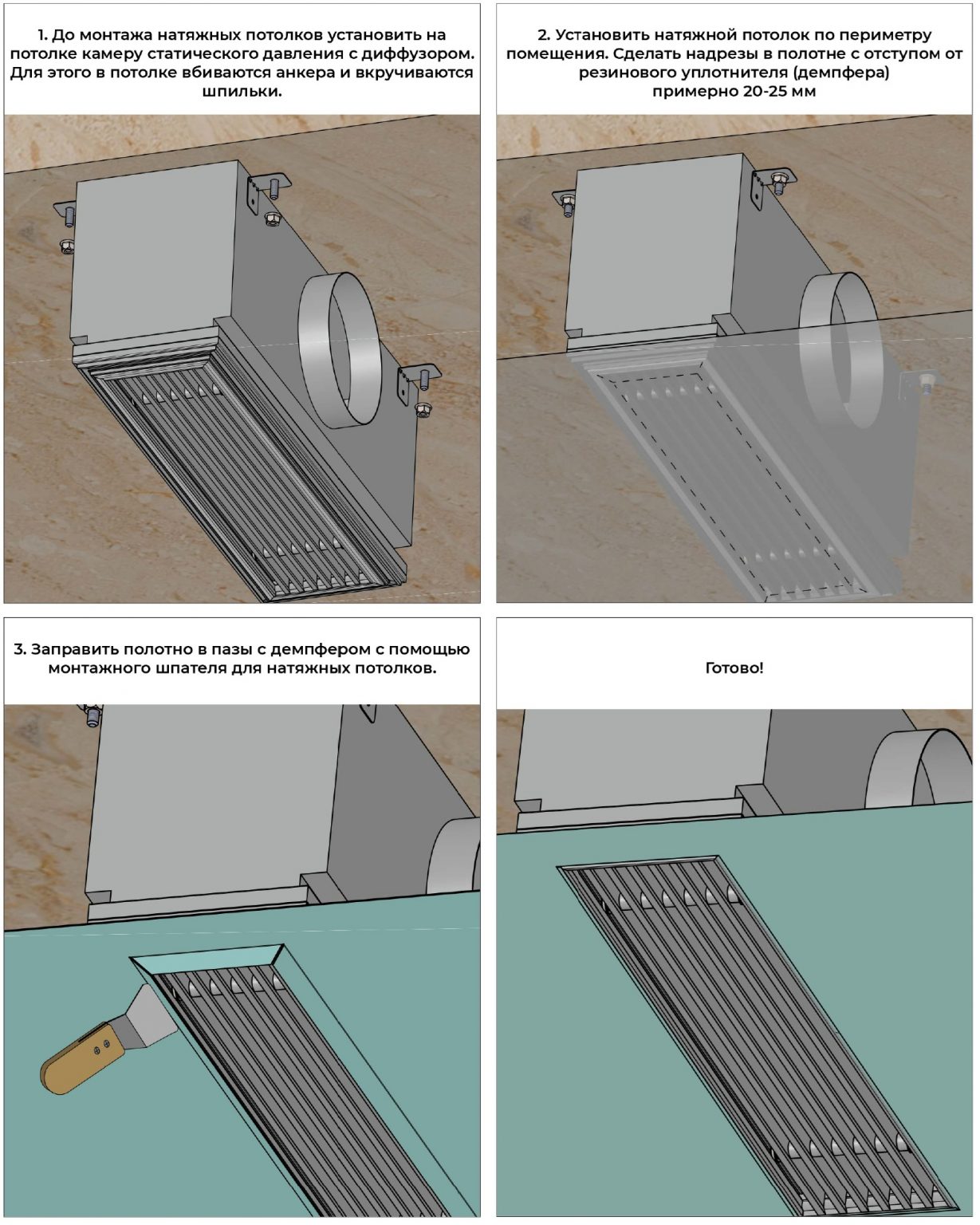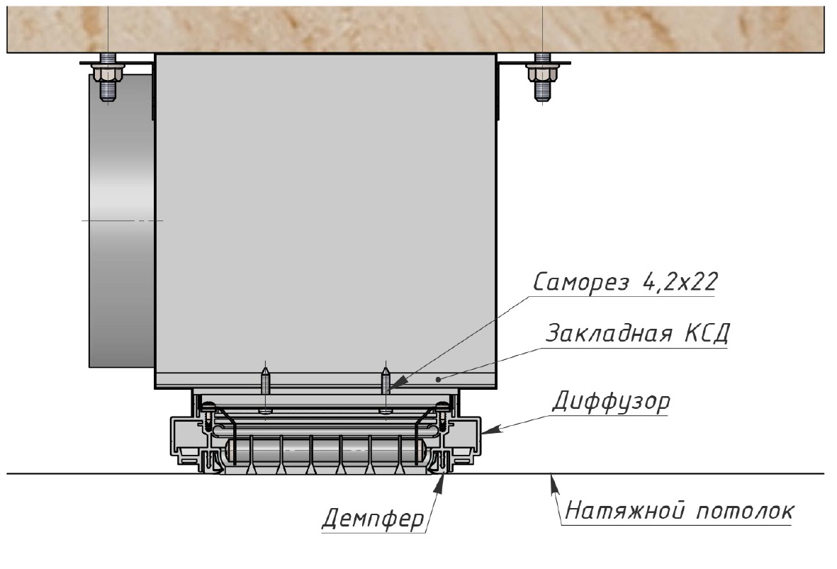 Для подключения диффузоров к системе вентиляции и кондиционирования используется камера статического давления (КСД или КСР). Она обеспечивает равномерное распределение воздушных масс через сечение решетки.