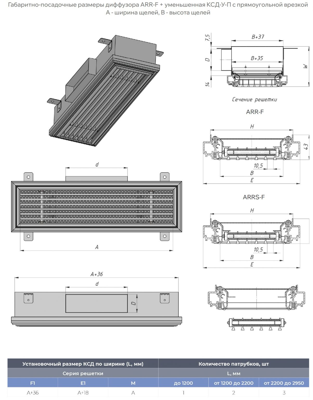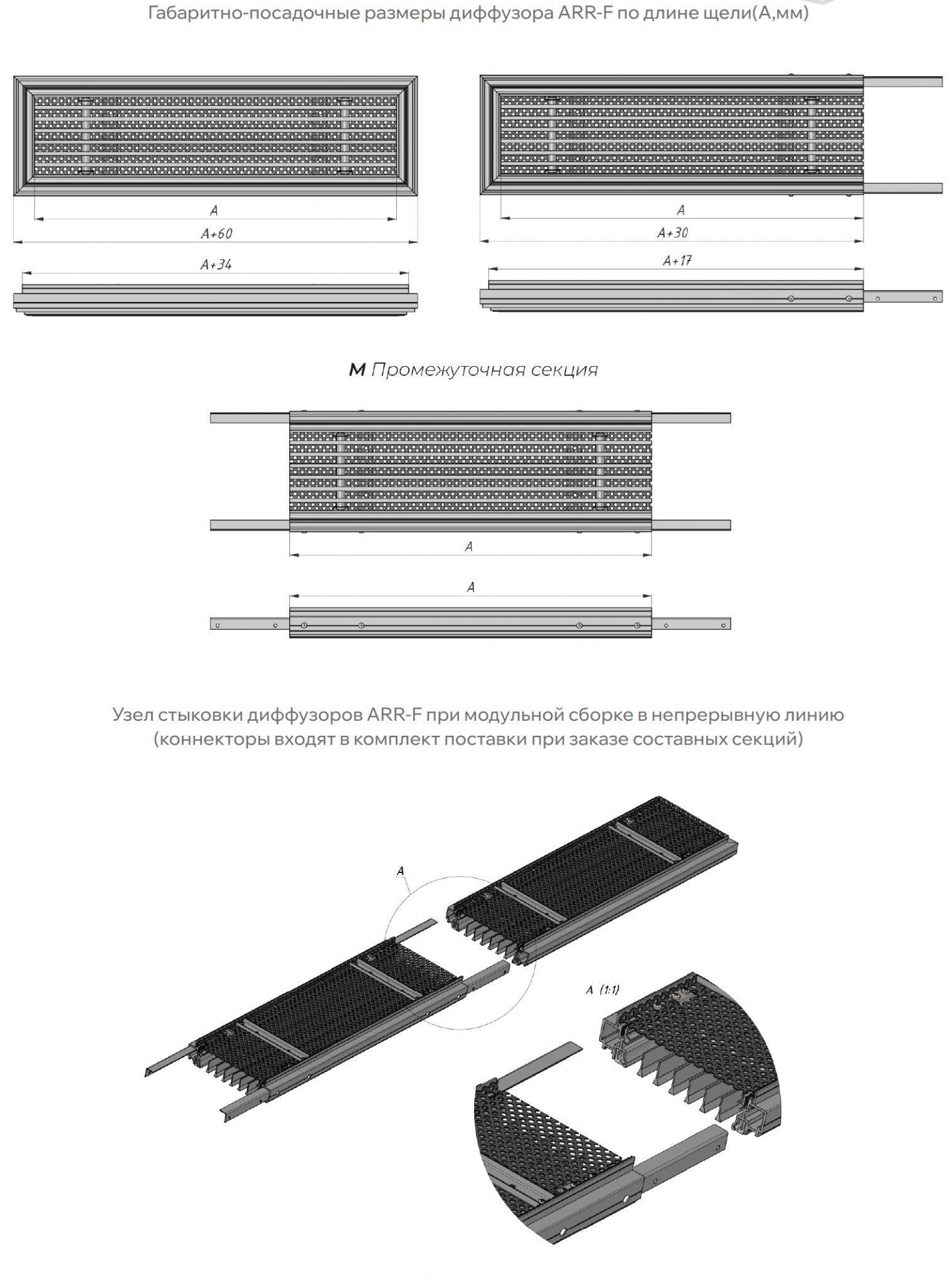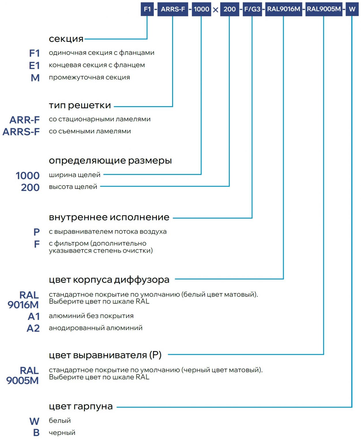 Щелевые решетки ARR-F и ARRS-F изготавливаются из экструдированного алюминиевого профиля АД31 по ГОСТ 22233-2018. По умолчанию корпус решетки окрашивается в стандартный белый цвет RAL 9016М матовый, а внутреннее исполнение в чёрный цвет RAL9005М матовый. По индивидуальному заказу возможна окраска в любой цвет по шкале RAL. Статическая камера изготавливается из оцинкованной листовой стали 0,4 – 1,5 мм в зависимости от размера и пожелания заказчика. По умолчанию все изделия поставляются в неокрашенном виде.