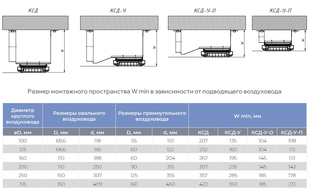 Уменьшенная камера статического давления позволяет максимально сохранить полезную площадь помещения за счет уменьшения монтажного пространства. Размер монтажного пространства (W) напрямую зависит от размера подключаемого воздуховода – чем меньше воздуховод, тем меньше адаптер для диффузора. В каталоге приведены рекомендуемые размеры воздуховода, но по запросу заказчика возможно изготовить адаптер с любой врезкой.