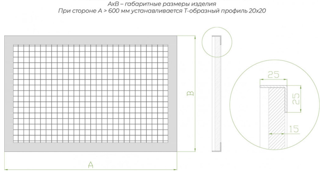 Решетки данного вида включают в себя изделия стандартных типоразмеров, а также возможно изготовление любых размеров с шагом 1 мм. Минимальные рекомендуемые размеры 100х100 мм. Максимальные рекомендуемые размеры 1200х1200 мм. Определяющие размеры при заказе – габаритные.