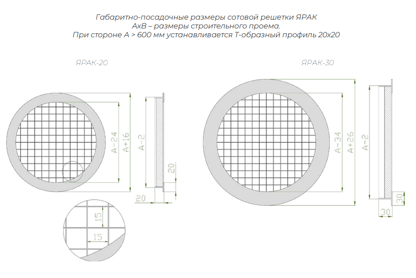 Решетки ЯРАК изготовлены из алюминиевого тавра 20 мм (ЯРАК-20) или 30 мм (ЯРАК-30) и ячеистой вставки с квадратными ячейками 15х15 мм. Особенностью данной модели перед решетками других видов является повышенный коэффициент живого сечения, за счет ячеек, сделанных из тонкого листа алюминия.