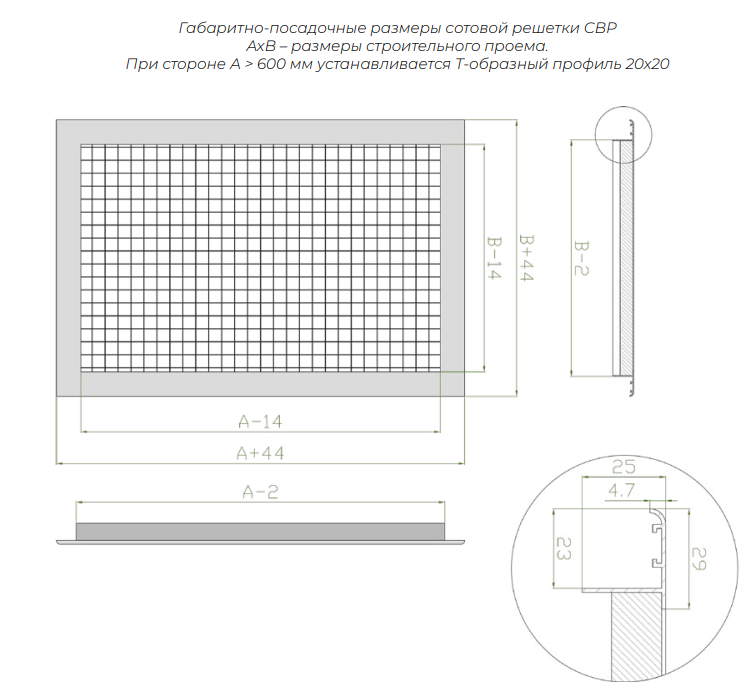 Ячеистая вентиляционная решетка ЯРА изготовлена из алюминиевой рамки и сотовой вставки с ячейками 15х15. Изделие изготавливается из алюминиевого профиля АД31 (ГОСТ 22233-2001). Конструкция решетки предусматривает стандартное крепление с помощью винтового соединения (соединительные отверстия у решетки расположены с лицевой стороны основания решетки) или специальными защелками. Для решеток ЯРА предусмотрена возможность оснащением блоком регулировки воздуха БРВ и адаптером для присоединения к воздуховоду. Изделие покрывается порошковой полиэфирной краской в базовый белый цвет (RAL 9016), под заказ – в любой оттенок (по международному каталогу RAL). Размерный ряд изделий включает в себя стандартные типоразмеры, а также индивидуальные – по размерам заказчика.