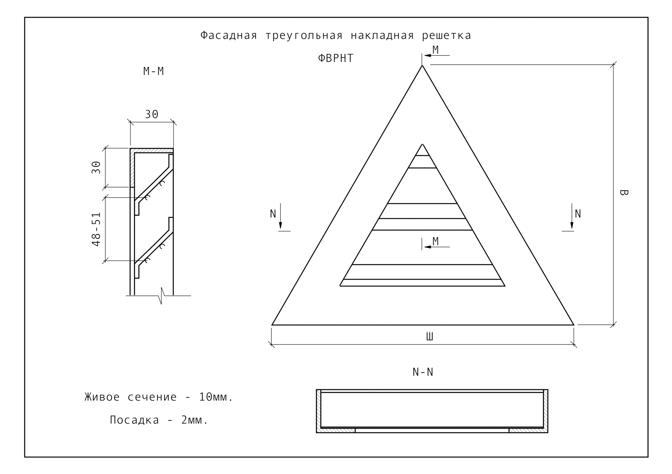 Треугольная накладная вентиляционная решетка ФВРНТ представляет собой раму треугольной формы из алюминиевого профиля выполненная по накладному типу и установленные в нее жалюзи Z- образной формы. Конструкция изготавливается из алюминиевого профиля АД31 (ГОСТ 22233-2001). Изделие покрывается порошковой полиэфирной краской в базовый белый цвет (RAL 9016), под заказ – в любой оттенок (по международному каталогу RAL). Размерный ряд изделий включает в себя стандартные типоразмеры.