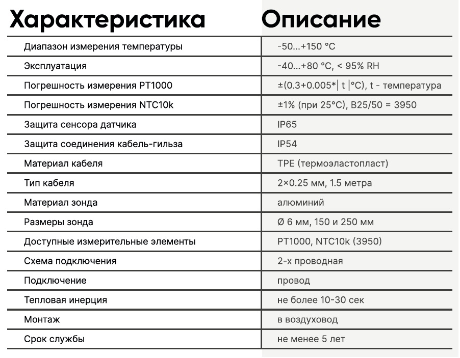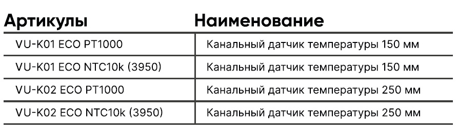Канальные датчики температуры серии VU-K ECO применяются в системах вентиляции и кондиционирования для измерения температуры воздуха в канале. Измерительный элемент датчика расположен в полой алюминиевой трубке на расстоянии 6–10 мм. от среза, кабель зафиксирован в трубке с помощью технологии «обжима», а измерительный элемент (сенсор) датчика защищён отпыли и влаги по стандарту не ниже IP65 по технологии «ТСА» (заливка термопроводящим герметиком).