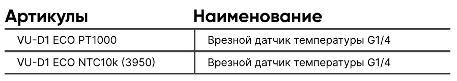 Погружные (врезные) датчики температуры серии VU-D1 ECO применяются для измерения температуры внутри трубопроводов в системах теплоснабжения, вентиляции, фанкойлов или радиаторов систем отопления в административных и производственных зданиях. Сенсор датчика температуры размещён в штуцере из нержавеющей стали с резьбой G1/4 дюйма и защищён от пыли и влаги по стандарту не ниже IP67 по технологии «ТСА» (заливка термопроводящим герметиком).
