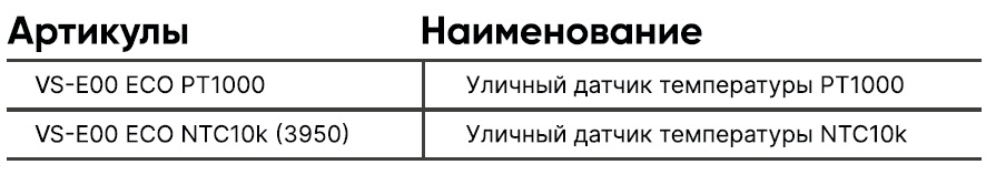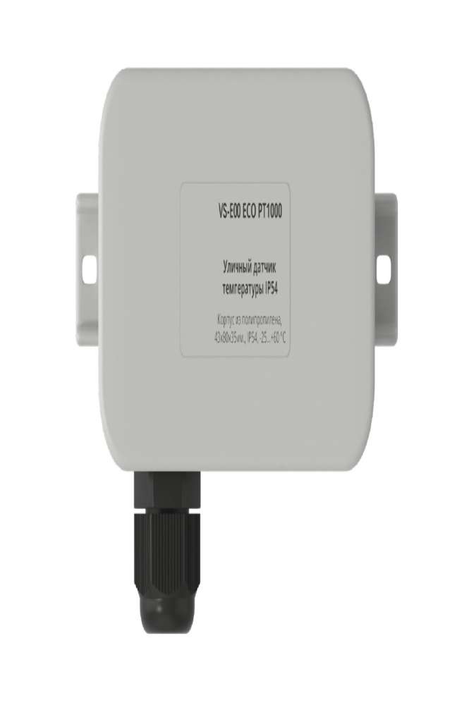 Уличные датчики температуры серии VS-E00 ECO применяются для измерения температуры воздуха на улице, а также в производственных и технологических помещениях. Измерительный элемент (сенсор) размещается на боковой стенке корпуса или на клеммном блоке, что позволяет нивелировать влияние температуры стен зданий на его показания. Датчик состоит из пластикового корпуса с интегрированным сальником для ввода кабеля. Сенсор датчика защищён от пыли и влаги по стандарту не ниже IP54.